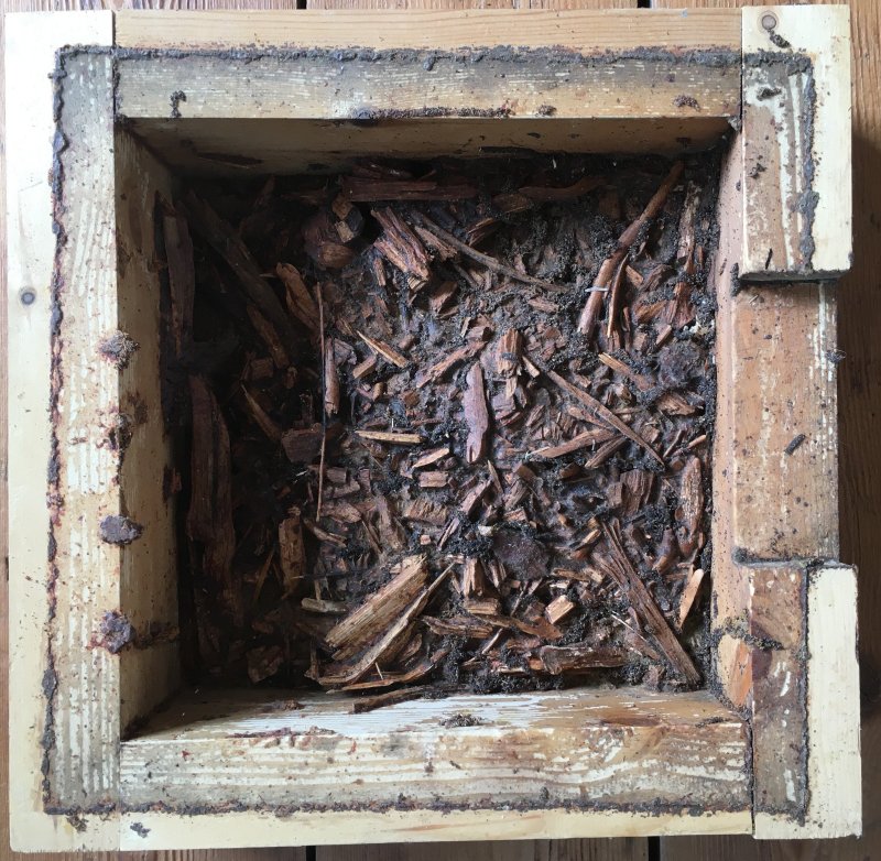 John Moerschbacher's sump (shown above) differs from that of Dav Croteau in that there is a mesh screen over the top of it immediately below the hive entrance that is cut into the rim of the sump. It rests on the ground. It is essentially a mesh floor in which the ground replaces the drawer commonly fitted under mesh floors. There is no access for draughts under the mesh. Tom Bruwier's (Belgium) sump with litter Left: base Centre: sump contents retainer mesh Right: sump box on base